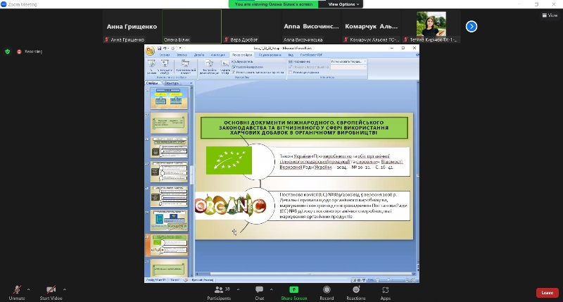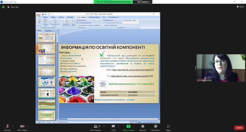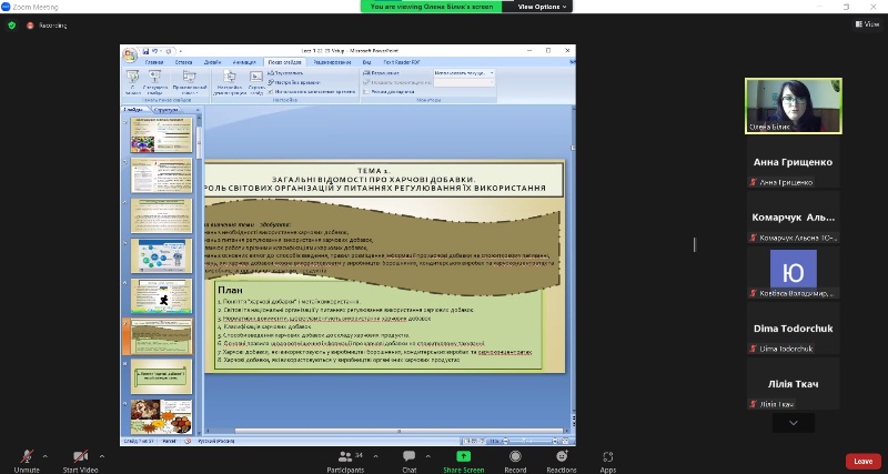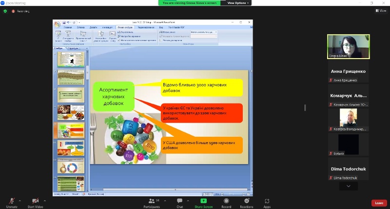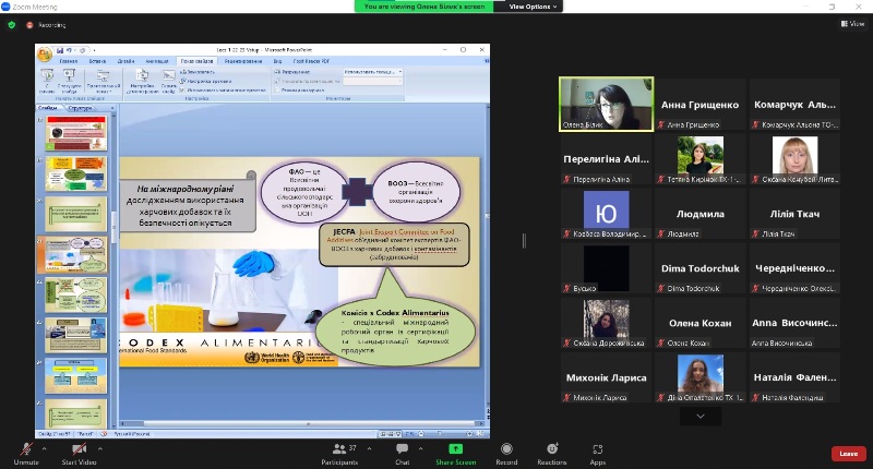 Відбулася відкрита лекція доцентки кафедри технології хлібопекарських і кондитерських виробів Олени Білик з дисципліни «Регулювання використання харчових добавок в різних технологіях та гармонізація Європейських регламентів в Україні на шляху Євроінтеграції», яку вона прочитала для здобувачів вищої освіти освітнього ступеня «Магістр» освітньо-професійних програм «Технології хліба, кондитерських, макаронних виробів та харчоконцентратів» і «Технології органічних харчових продуктів».