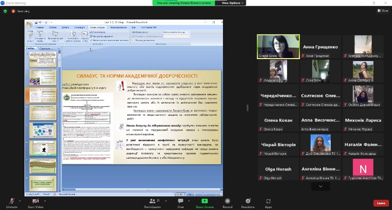 Зважаючи на те, що це була перша лекція, Олена Білик довела до відома студентів інформацію про структуру освітньої компоненти, силабус дисципліни та наголосила на обов’язковому дотриманні правил академічної доброчесності під час навчання.