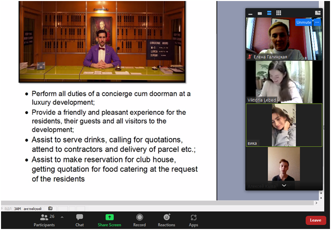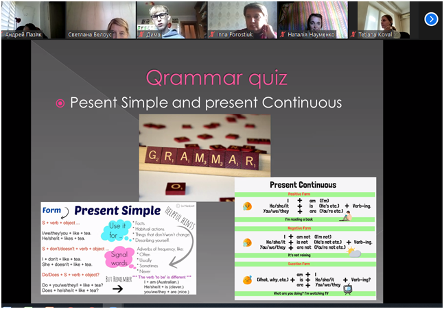 За допомогою можливостей Zoom кожний студент зміг долучитися до інтерактивних вправ, зокрема «Warming up», певної розминки на початку заняття та, використовуючи кольорові олівці, за допомогою яких опрацьовувалося завдання, на закріплення граматичної теми.