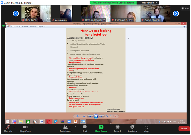 Викладачка кафедри іноземних мов професійного спрямування Вікторія Лебідь провела відкрите практичне заняття «Job advertisement. Skills and qualities» з дисципліни «Іноземна мова (за професійним спрямуванням)» для здобувачів вищої освіти групи ТУ-1-12а факультету готельно-ресторанного та туристичного бізнесу.