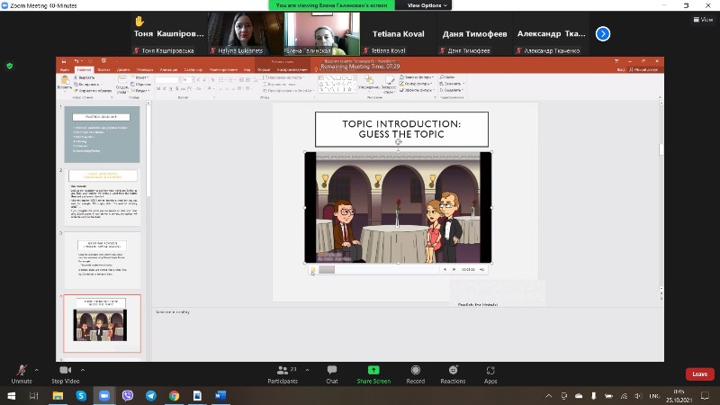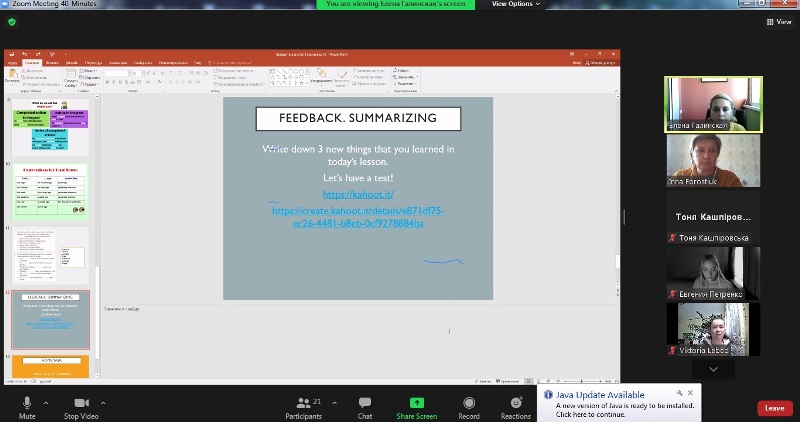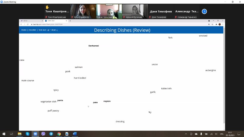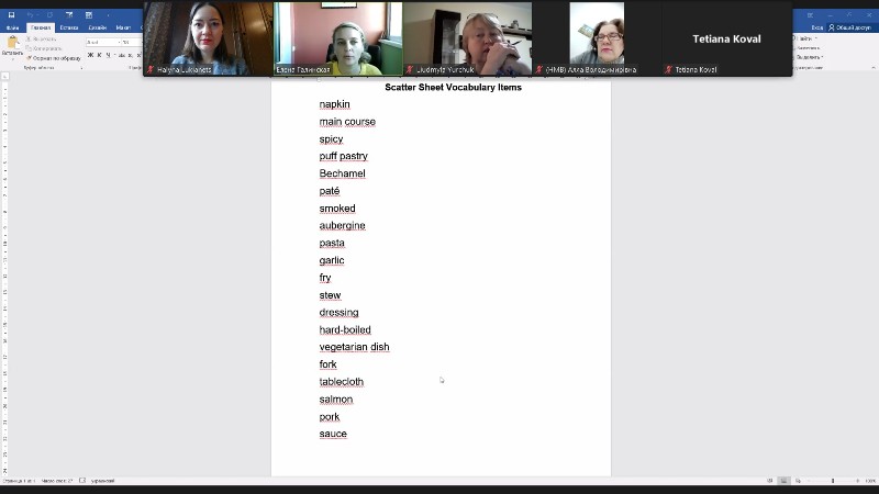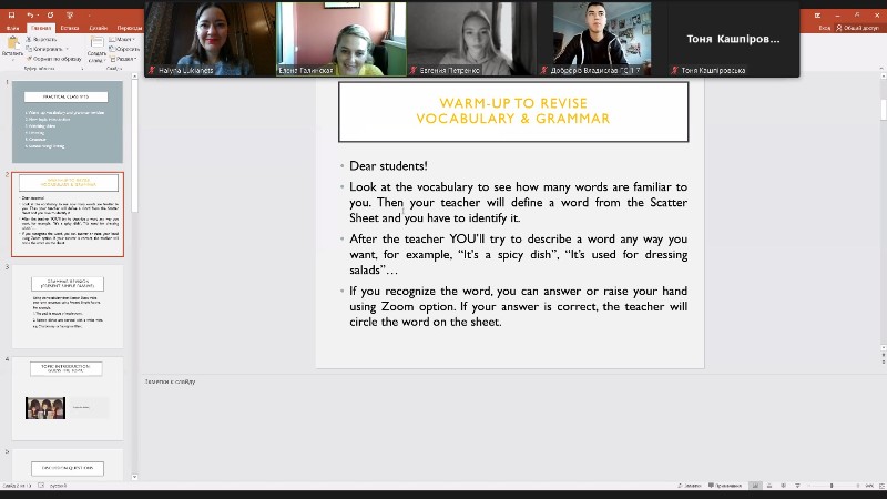 На початку заняття з метою перевірки лексики з попереднього заняття викладачкою була використана інтерактивна онлайн-діяльність під назвою Scatter Sheet (аркуш, на якому рандомно розкидані слова по темі, що вивчалася або буде вивчатися). Завданням викладачки було описати те чи інше слово англійською, а завданням слухачів – його відгадати. Далі здобувачам пропонувалося описувати і відгадували слова самостійно, що розвивало комунікативні навички з англійської.