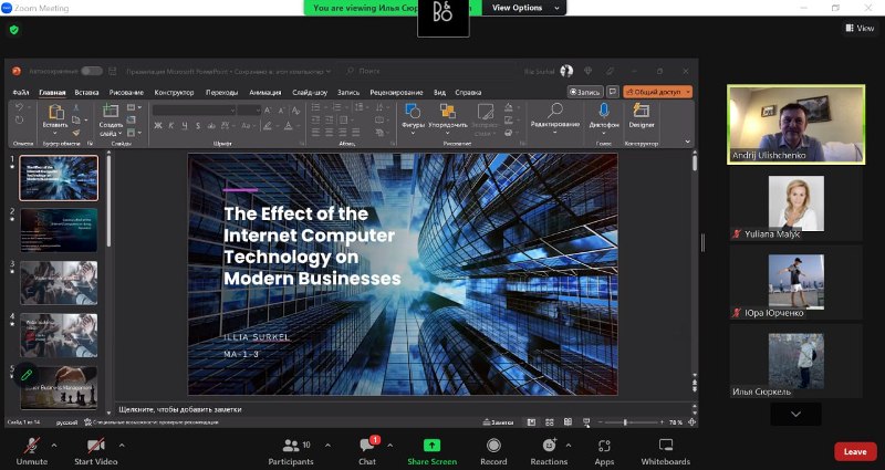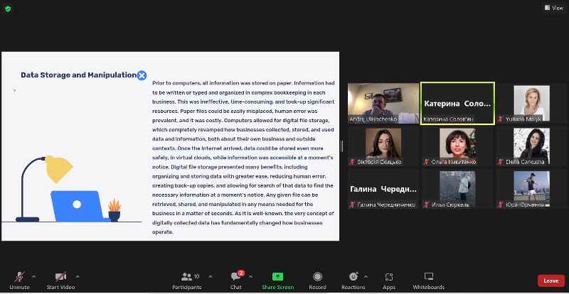 Здобувачі освіти підготували цікаві та змістовні презентації, поділилися своїми міркуваннями і про сучасні можливості використання новітніх комп’ютерних технологій у бізнесі, і про ймовірні перспективні шляхи розвитку. Зацікавленість, активна участь у комунікації показали особистісну значущість запропонованої теми для кожного учасника спілкування, під час якого було зосереджено увагу на різних аспектах: комп’ютерні технології допомагають підприємствам стати більш продуктивними, заощадити гроші, покращити взаємодію з клієнтами, впорядкувати комунікації, покращити процес прийняття управлінських рішень тощо.