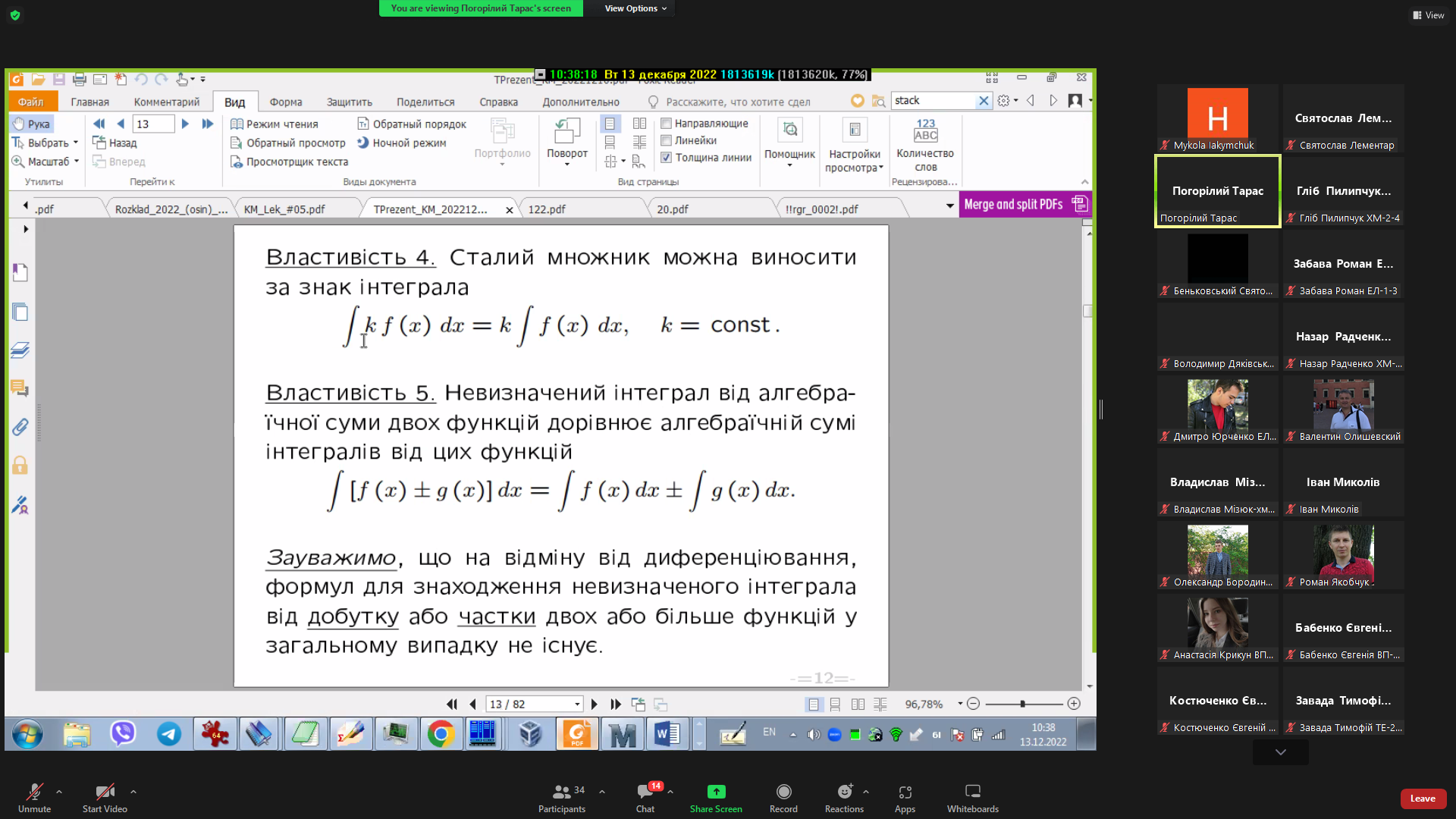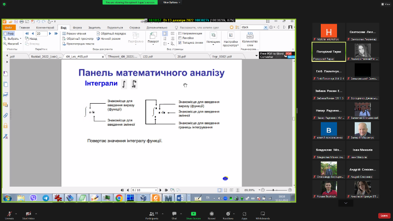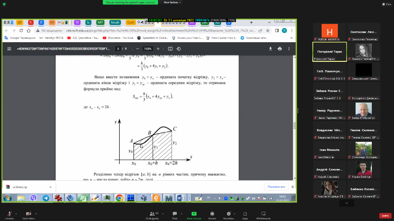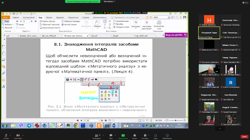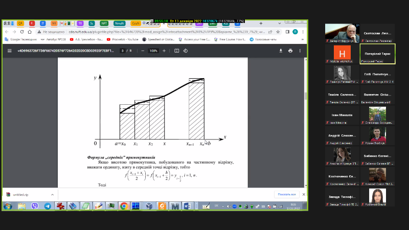 13 грудня 2022 року на кафедрі технологічного обладнання та комп’ютерних технологій проектування в онлайн-режимі відбулася відкрита лекція з дисципліни «Комп'ютерна математика» для здобувачів освітнього ступеня «бакалавр», освітньо-професійної програми «Прикладна механіка» (група ПМ-2-1), освітньо-професійної програми «Інжиніринг харчових та біотехнологічних виробництв» (група ОХ-2-2), освітньо-професійної програми «Електротехніка та інформаційні технології» (група ЕЛ-2-3), освітньо-професійної програми «Холодильні техніка та технології» (група ХМ-2-4), освітньо-професійної програми «Теплоенергетика та енергоефективні технології» (група ТЕ-2-5) та освітньо-професійної програми «Комп’ютерні технології дизайну та виготовлення упаковки» (група ВП-2-6). Лектор – доцент Тарас Погорілий. Тема лекції – «Інтегральне числення і ряди».