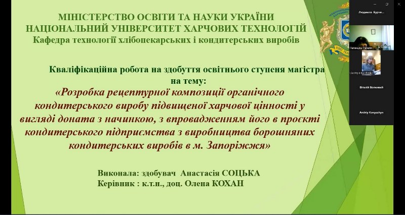 На кафедрі технології хлібопекарських і кондитерських виробів відбувся захист магістерських кваліфікаційних робіт здобувачів освітньо-професійної програми «Технології органічних харчових продуктів».