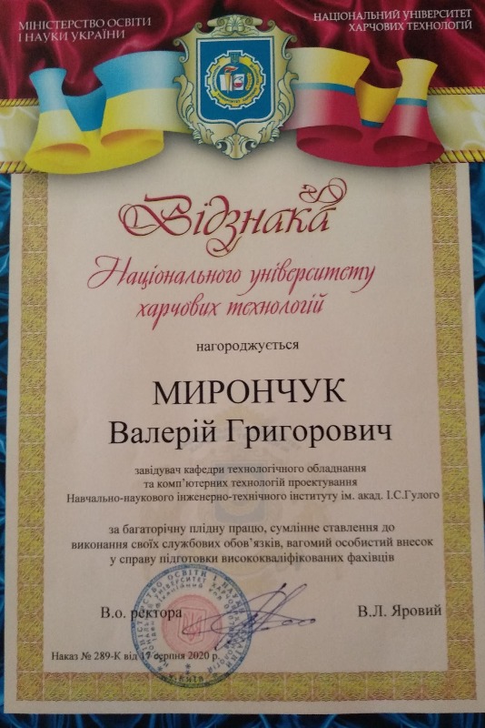 - нагрудним знаком «Відзнака Національного університету харчових технологій доктор технічних наук, професор, завідувач кафедри технологічного обладнання та комп’ютерних технологій проєктування Навчально-наукового інженерно-технічного інституту ім. акад. І.С.Гулого Валерій Мирончук;