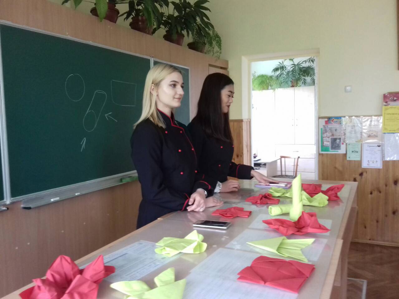 Наші студентки завітали, як до учнів 9-11 класів, які вже зовсім скоро стануть абітурієнтами, так і до учнів 3 класу, в яких такий інтерактивний майстер-клас викликав яскраві емоції. Школярі з ентузіазмом опановували способи складання серветок «лілія», «королівська мантія», «свічка», «тіара», «колона», які використовують у закладах ресторанного господарства. Під час майстер-класу студенти поділилися враженнями від навчання на факультеті готельно-ресторанного та туристичного бізнесу, а також можливістю для творчої і особистої реалізації у культурно-масовому, спортивному, громадському житті університету. Тетяна Сильчук розповіла учням випускових класів про спеціальності та спеціалізації, за якими здійснюється підготовка, а також особливості цьогорічної вступної кампанії.