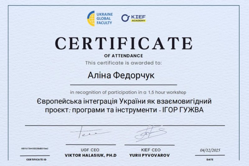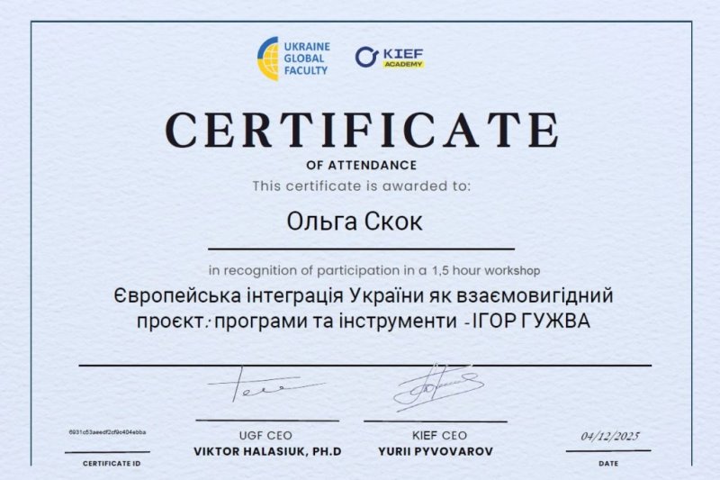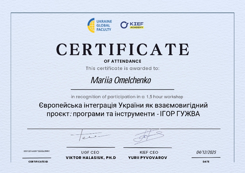 У межах розширення професійної компетентності та ознайомлення з актуальними тенденціями економічного розвитку асистентка кафедри технології ресторанної і аюрведичної продукції Марія Омельченко взяла участь у черговому циклі семінарів, присвячених міжнародній співпраці, фінансовій безпеці бізнесу та ролі євроінтеграції у трансформації української економіки.