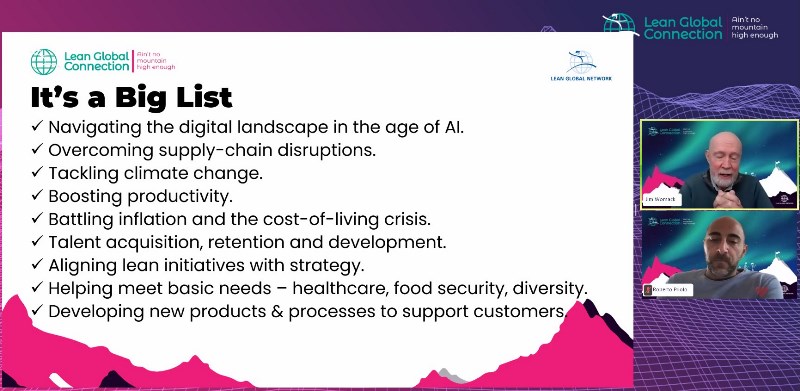 Цього року на Lean Global Connection були представлені організації з усього світу: IKEA, Mercedes-Benz, Crocs, Avianca, Х'юстонський продовольчий банк, Medair, Coloplast, Proditec, TechnipFMC, Lean Global Network, Lean Enterprise Academy, Lean Institute Ukraine та багато інших. Вони використовують практики LEAN-мислення для ефективного вирішення ключових викликів. Зокрема таких як: подолання наслідків бойових дій для економіки та суспільства; навігація цифровим ландшафтом в епоху штучного інтелекту; подолання збоїв у ланцюгах поставок; зелена революція: боротьба зі зміною клімату; підвищення продуктивності; узгодження стратегії з діяльністю; охорона здоров'я, продовольча безпека, прагнення до сталого розвитку; розроблення нових продуктів і послуг для клієнтів