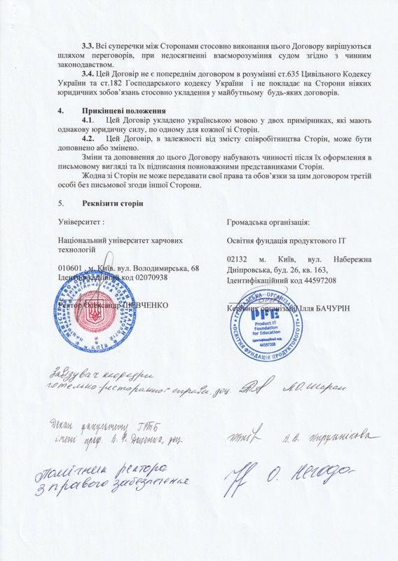Взаємодія сторін наразі здійснюється в межах інтеграції та реалізації навчального модуля «Створення та розвиток ІТ-продуктів» у рамках дисциплін «Інформаційні технології та програмні продукти» і «Моделювання діяльності закладів готельно-ресторанного господарства» факультету Гготельно-ресторанного та туристичного бізнесу імені проф. В.Ф.Доценка.