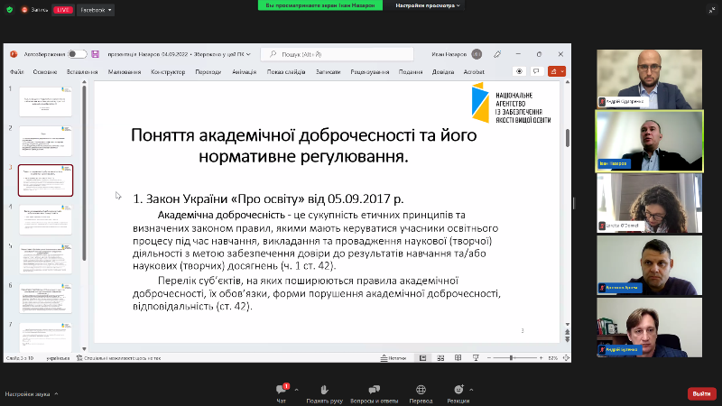 Спікери – заступник голови Національного агентства із забезпечення якості вищої освіти Іван Назаров описав роль і завдання Національного агентства із забезпечення якості вищої освіти у просторі академічної доброчесності; член Національного агентства із забезпечення якості вищої освіти Артем Артюхов розповів про систему забезпечення академічної доброчесності у закладах вищої освіти та її зовнішнє оцінювання на шляху до світових стандартів; експерт із академічної доброчесності, комерційний директор Unicheck Україна Андрій Сідляренко виступив із доповіддю «Академічна доброчесність і застосування інформаційних технологій»; проректорка з навчальної роботи Університету Назарбаєва (Казахстан) Loretta O'Donnell поділилася досвідом університету по впровадженню академічної доброчесності; секретарка Комітету освіти, науки та інновацій Верховної Ради України Наталія Піпа повідомила про зміни в законодавстві для підвищення академічної доброчесності. Наприкінці заходу спікери дали відповіді на запитання слухачів.