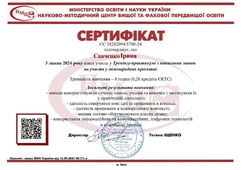 Під час курсу слухачі ознайомилися з можливостями участі закладів фахової передвищої освіти у міжнародних проєктах, методиками написання заявок на участь у проєктах, особливостями пошуку партнерів, практиками написання проєктів. За результатами навчання слухачі отримали сертифікат про підвищення кваліфікації.