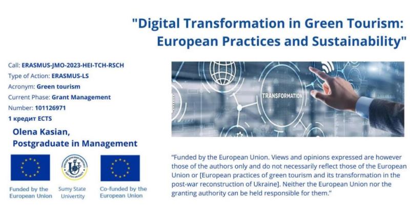 Доцентка кафедри економіки і права, гарантка освітньої програми «Економіка та правове забезпечення бізнесу» Оксана Відоменко з 30 жовтня по 13 листопада 2024 року проходила навчання на англомовному курсі «Цифрова трансформація в зеленому туризмі: європейські практики та сталість» (обсягом 1 кредит ECTS), організованому в рамках проєкту Жана Моне «The Role of European Practices in Green Tourism for Ukraine’s Post-War Recovery» (Jean Monet Module 101126971 LS ERASMUS-JMO-2023-HEI-TCH-RSCH), та 13 листопада взяла участь у дебатах на тему «European practices of green tourism and their transformation in the conditions of the post-war reconstruction of Ukraine».