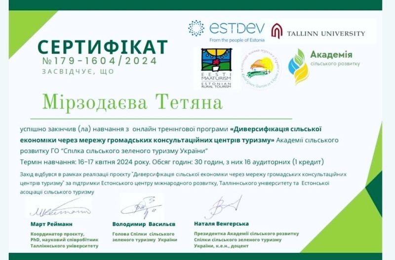 Доцентка кафедри туристичного та готельного бізнесу Тетяна Мірзодаєва успішно завершила онлайн-навчання в рамках тренінгової програми «Диверсифікація сільської економіки через мережу громадських консультаційних центрів туризму».