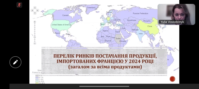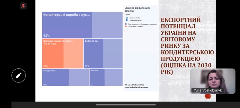 Асистентка кафедри технології ресторанної і аюрведичної продукції Марія Омельченко долучилася до вебінару з презентації аналітичного дослідження ринку кондитерських виробів Франції, організованого Офісом з розвитку підприємництва та експорту, національним проєктом «Дія.Бізнес» спільно з Асоціацією виробників кондитерської, харчоконцентратної та крохмалопатокової галузей України (Укркондпром) за підтримки Швейцарської програми просування імпорту (SIPPO), яка ініційована державним секретаріатом Швейцарії з економічних питань (SECO) у межах співробітництва у сфері економічного розвитку.