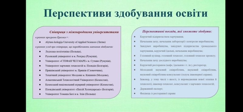 Людмила Мамченко запросила випускників на День вступника НУХТ, що відбудеться 21 червня 2024 р., де вони матимуть можливість отримати вичерпну інформацію щодо умов вступу й навчання за скороченою формою для отримання повної вищої освіти за спеціальністю 181 «Харчові технології», освітньо-професійною програмою «Технології харчування». Викладачка акцентувала увагу випускників, що освітні програми НУХТ відповідають високим національним та іноземним стандартам і забезпечують високу конкурентоспроможність спеціалістів на ринку праці.