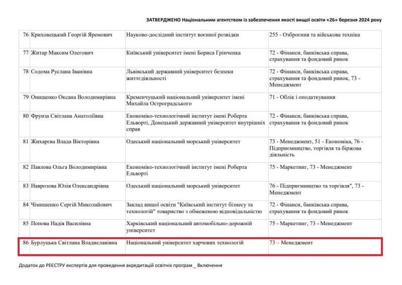 Ще одна викладачка нашого університету увійшла до числа експертів з акредитації освітніх програм. Рішення щодо включення професорки кафедри економіки праці та менеджменту Світлани Бурлуцької до реєстру експертів було прийняте на засіданні Національного агентства із забезпечення якості вищої освіти 26 березня 2024 року.