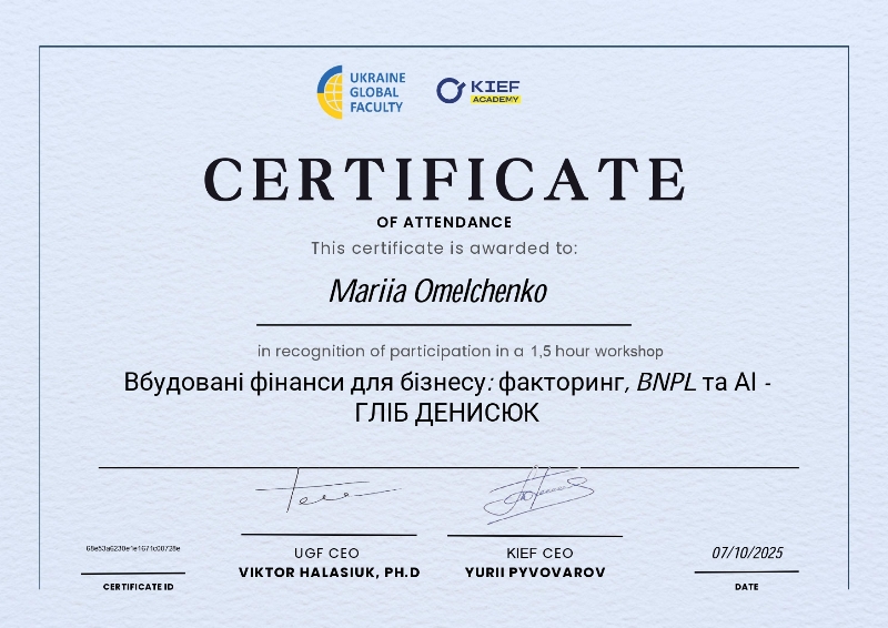 Під час першого заходу «Вбудовані фінанси для бізнесу: факторинг, BNPL та АІ», який провів радник з розвитку та стратегічних партнерств компанії Activitis Гліб Денисюк слухачі ознайомилися з концепцією вбудованих фінансів як частини бізнес-процесів, що дозволяє зменшити ручну працю, адаптувати фінансові ліміти до потреб клієнтів і забезпечити стабільний грошовий потік. Особливу увагу спікер приділив взаємодії BNPL (buy now, pay later) і факторингу, які разом формують ефективну модель підтримки продажів і управління готівковими потоками. Також розглянуто роль штучного інтелекту як інструменту для аналітики, управління ризиками та автоматизації фінансових рішень.