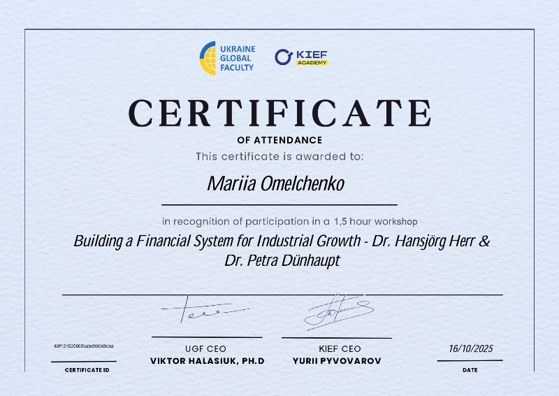 Асистентка кафедри технології ресторанної і аюрведичної продукції Марія Омельченко долучилася до лекцій, проведених у межах Проєкту «Український глобальний факультет», що реалізується Академією КМЕФ за підтримки Фонду ім. Фрідріха Еберта та фінтех-компанії Activitis, присвячених викликам і можливостям у сфері сучасних фінансів і промислового розвитку.