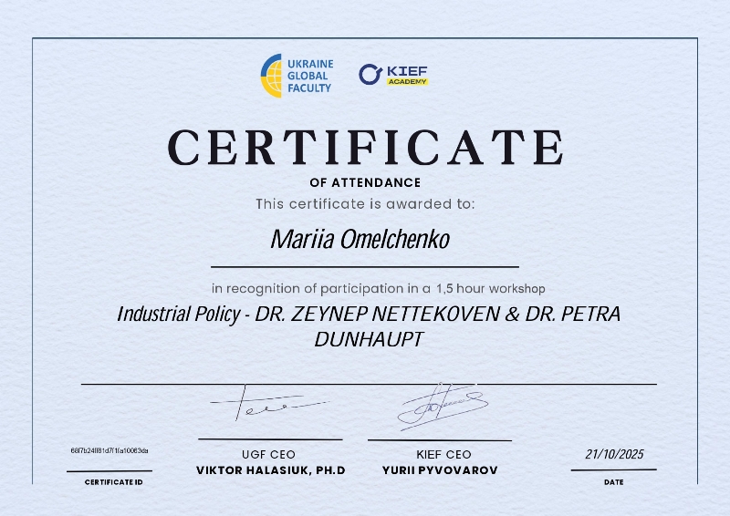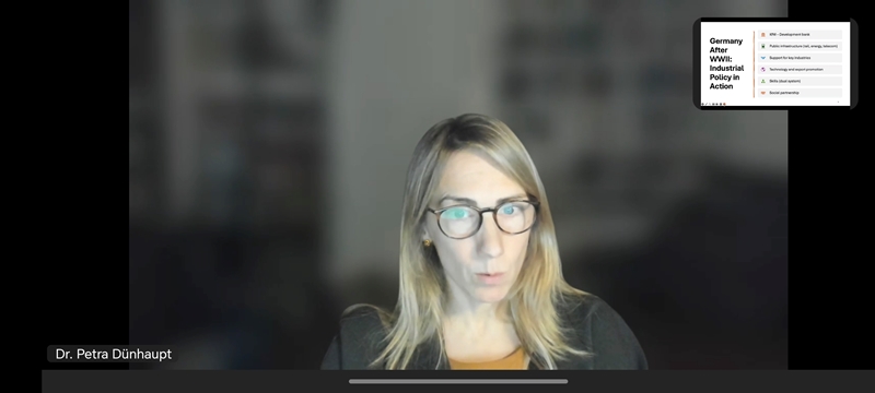 Під час першого семінару «Промислова політика» координаторка Дослідницького компетентнісного центру «Виклики та стійкість глобальних ланцюгів постачання і створення доданої вартості» при Берлінській вищій школі економіки та права, докторка Петра Дюнгаупт і лекторка з економіки Європейської академії праці та Франкфуртського університету ім. Ґьоте, докторка Зейнеп Неттековен представили комплексне бачення ролі промислової політики у забезпеченні економічного зростання. Спікерки розкрили ключові цілі та форми промислової політики, підкреслили важливість обмінного курсу у розвитку національної економіки та розглянули його обмеження як інструмент державного регулювання у країнах, що розвиваються.