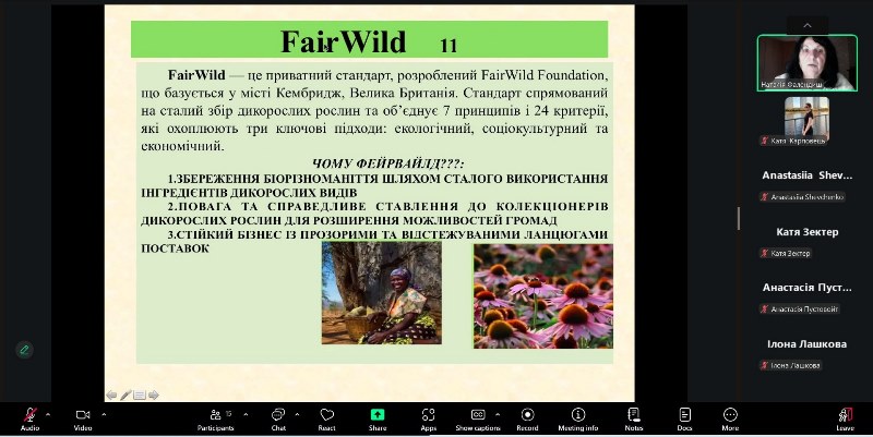 Лекторка детально зупинилася на питаннях сертифікації за міжнародним стандартом FairWild, який спрямований на сталий збір дикорослих рослин та об’єднує сім принципів і 24 критерії, що охоплюють три ключові підходи: екологічний, соціокультурний та економічний.