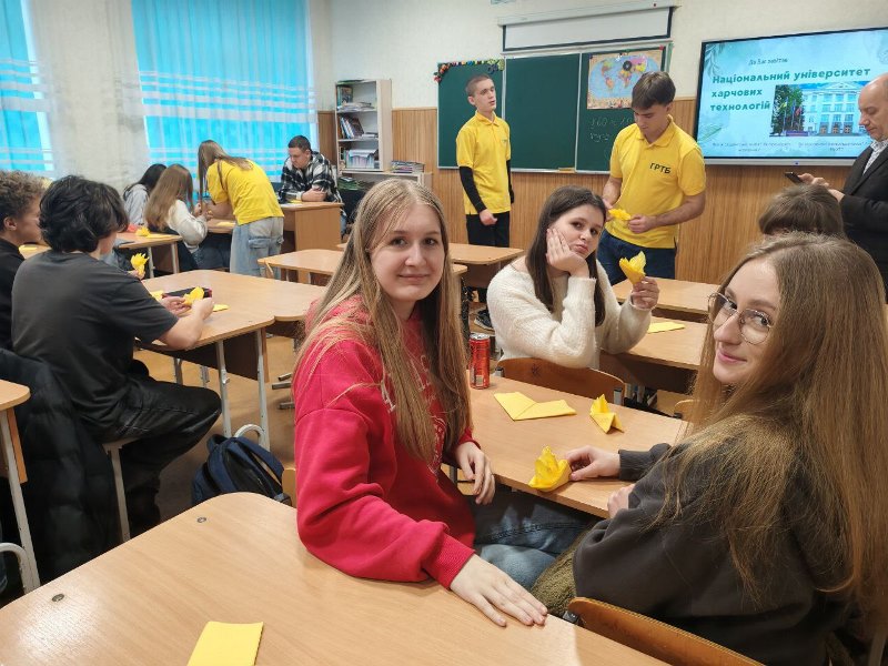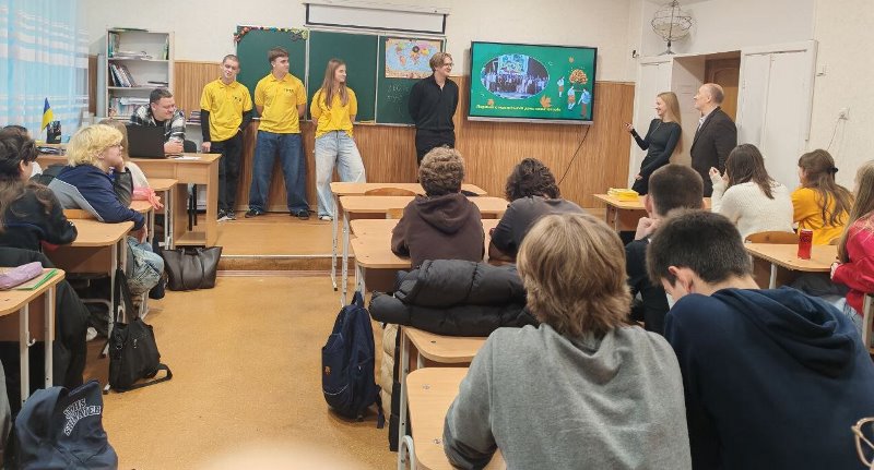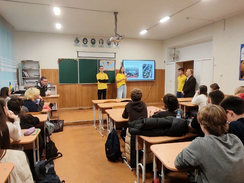 Далі відбулася зустріч з учнями 11-х класів. Олег Кузьмін презентував університет, розповів про його історію, освітні традиції, інноваційні підходи у навчанні, а також про широкий вибір освітніх програм, перспективи працевлаштування та можливості для розвитку студентів. Марія Омельченко поділилася власним досвідом навчання та професійного становлення, розповіла про актуальні напрями наукової роботи, студентські ініціативи, участь у міжнародних програмах і проєктах, акцентувавши на тому, що НУХТ відкриває для своїх студентів безліч шляхів самореалізації.