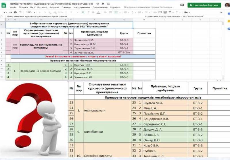 Прагнучи максимально врахувати побажання роботодавців і напрацювання кафедри у напрямку наскрізного дипломного проєктування, за якого здобувачі розпочинають роботу над кваліфікаційною випусковою бакалаврською роботою за два роки до захисту, нинішнім здобувачам третього курсу було запропоновано здійснити вільний вибір спрямування тематики курсового та дипломного проєктування. Кожний із них міг обрати той напрямок біотехнології, який його найбільше зацікавив. Перелік спрямувань, що налічує 16 напрямків: препарати на основі біомаси мікроорганізмів, ентомопатогенні та гербіцидні препарати, біотехнологічні препарати для рослинництва, заквашувальні композиції для виробництва кисломолочних продуктів, пробіотики і бактеріоцини, препарати на основі біомаси мікроорганізмів для природоохоронних біотехнологій, вакцини і тест-системи, амінокислоти, антибіотики, органічні кислоти, ферменти, вітаміни (а також пігменти і антиоксиданти), спирти і органічні розчинники, полісахариди + ПАР мікробного походження, препарати на основі рекомбінантних білків, препарати на основі вірусів, був згрупований за трьома категоріями біотехнологій (препарати на основі біомаси, препарати на основі метаболітів мікроорганізмів і препарати на основі вірусів та рекомбінантних білків).