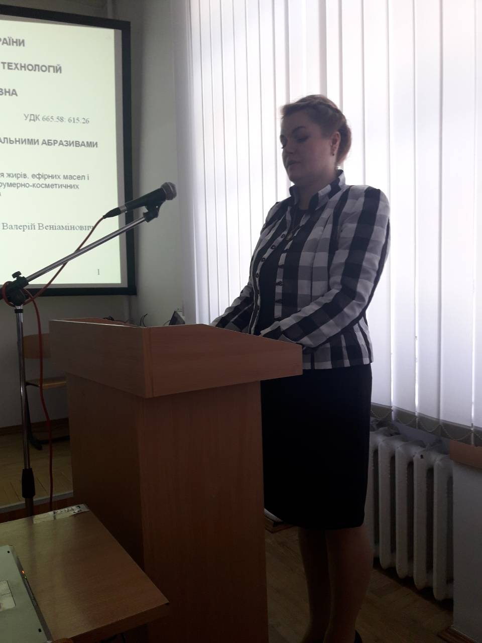 Випускниця аспірантури кафедри технології жирів і парфумерно-косметичних продуктів Тетяна Полонська успішно захистила кандидатську дисертацію «Технологія косметичного крему-пілінгу з мінеральними абразивами», виконану під керівництвом професора Валерія Манка.