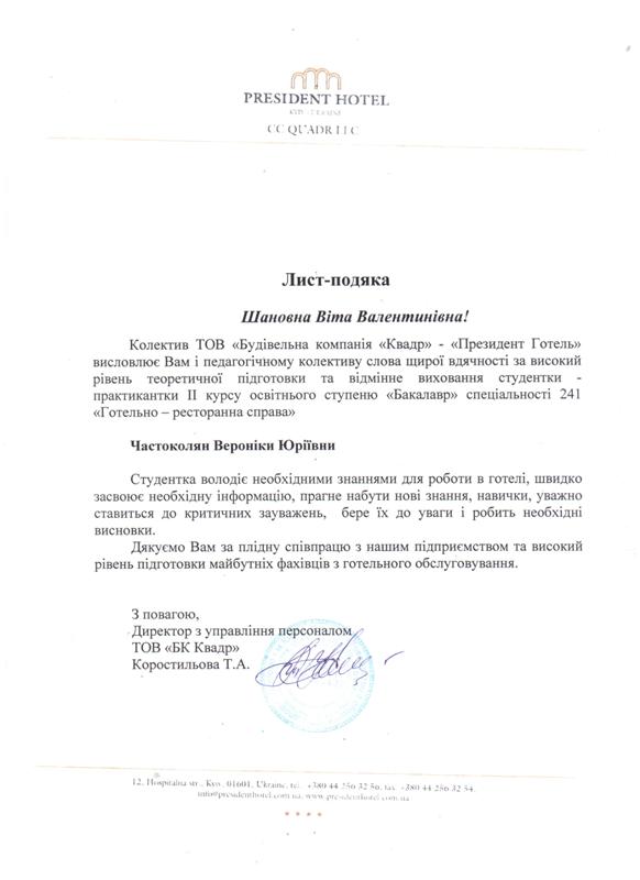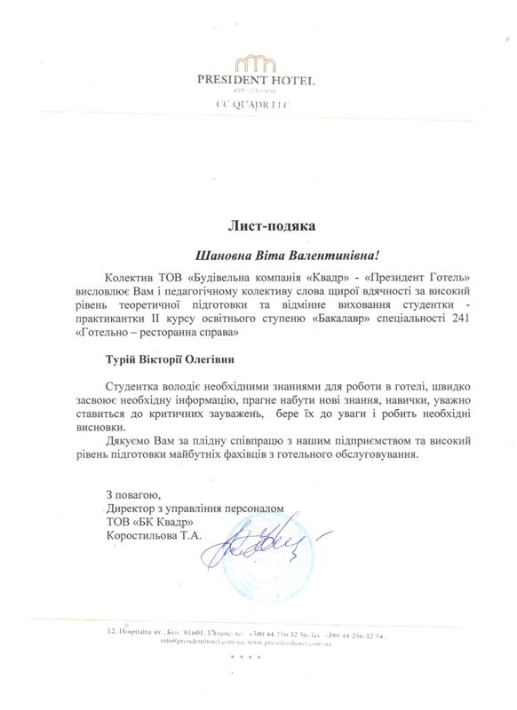 116 здобувачів освіти бакалаврського рівня були направлені до провідних готелів м. Києва: Hilton Kyiv (ТОВ «Міжнародний діловий центр»), President Hotel (ТОВ «БК Квадр»), Premier Palace Hotel Kyiv, ТОВ «Воздвиженський», Hyatt Regency Kiev (ПрАТ «Нові Інжинірингові Технології»), ТОВ «Рейкарц Хотел Менеджмент» та інших підприємств гостинності з різних регіонів України.