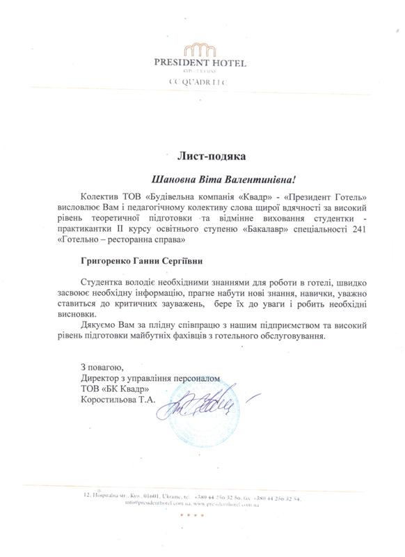 Колектив випускової кафедри готельно-ресторанної справи вдячний відповідальній від кафедри, доцентці Олені Шидловській за організацію практичної підготовки, керівникам практики від університету і готельних підприємств – за контроль за виконанням програми практики і написанням звітів, проведення консультацій і мотивацію здобувачів до професійного зростання.