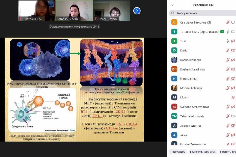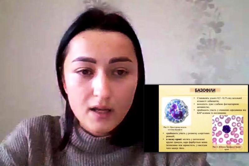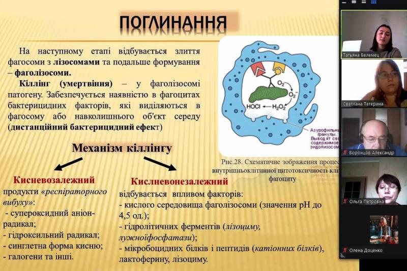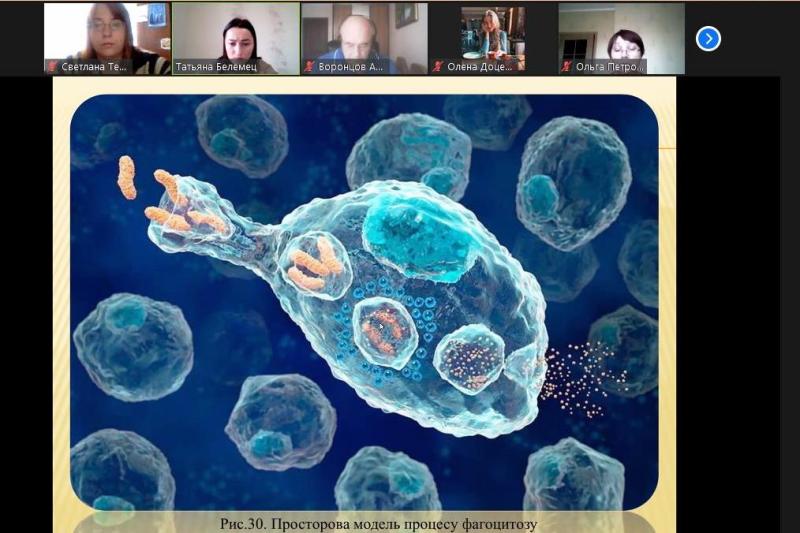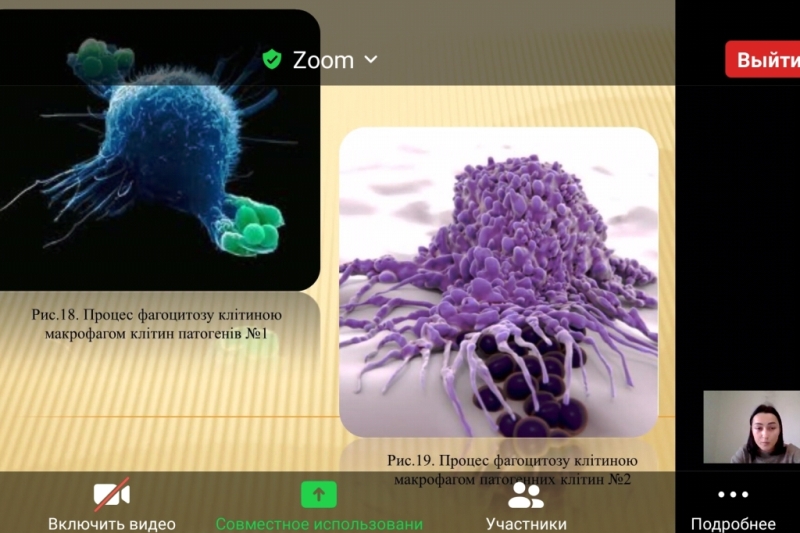 За доброю традицією проведення занять у режимі онлайн Zoom-конференцій, для початку асистент разом зі студентами визначили логічний і зручний план ведення взаємної роботи. Вже надалі неухильно дотримуючись плану викладачка та група БТ-2-2, відчайдушно «кинулись у бій» задля ще більш ідеального розуміння роботи своєї імунної системи. На допомогу цим баталіям прийшла мультимедійна презентація, котра включала найбільш яскраві та новітні ілюстрації, схеми й просторові моделі клітин-фагоцитів, а також процеси їх взаємодії з патогенними мікроорганізмами. Познайомившись із рядом наших союзників (клітинами-фагоцитами) у боротьбі з чужорідними загарбниками (патогенами), користуючись презентацією та підготовленим на базі новітніх наукових статей теоретичним матеріалом, асистентка детально розповіла студентам-біотехнологам про те, як же все таки вправно тримають оборону наші з вами імунні клітини, про процес фагоцитозу. На шляху до отримання завітної перемоги – чіткого розуміння роботи клітинного імунітету, студенти підтримували постійний діалог із викладачкою, яка також акцентувала увагу на найбільш стратегічно-важливих аспектах процесу.
