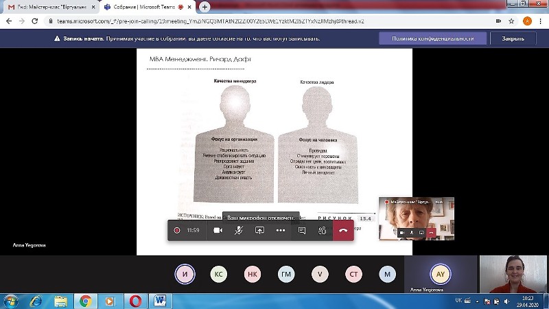 Викладачі всіх кафедр факультету біотехнології та екологічного контролю взяли активну участь у роботі майстер-класу, адже питання віртуального лідерства в нинішніх умовах стає надактуальним. Модератор заходу зацікавила викладачів сучасними поглядами на ефективну організацію роботи під час створення освітнього середовища у дистанційному форматі.