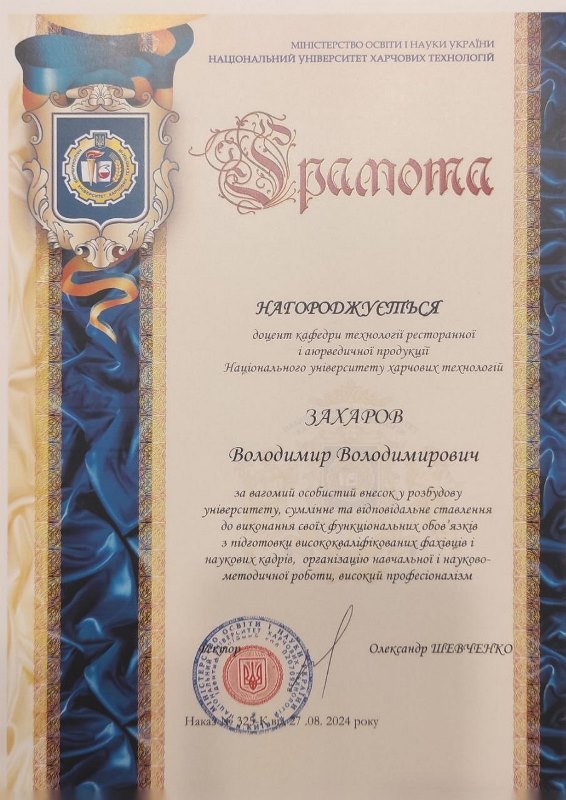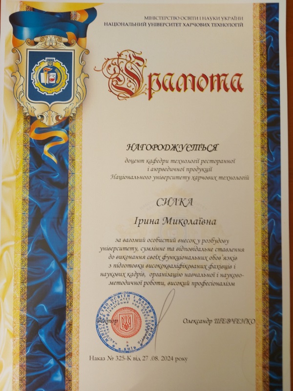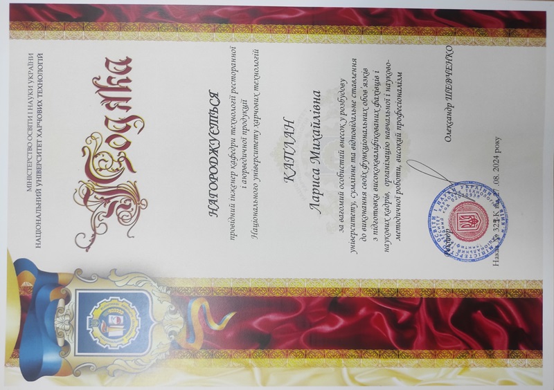 Фахівці кафедри технології ресторанної і аюрведичної продукції були відзначені за їхній вагомий внесок у розвиток навчального процесу, наукову діяльність та активну участь у житті університету.