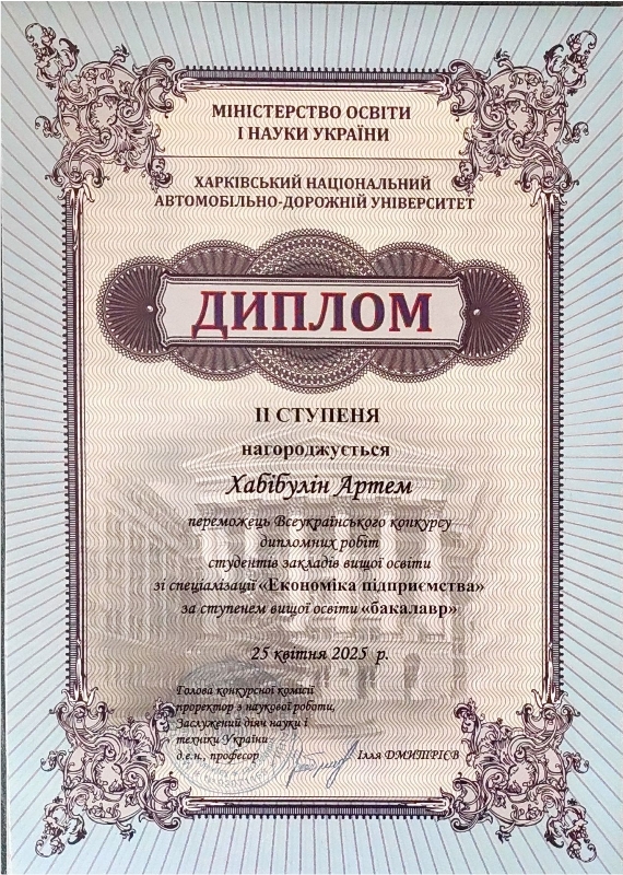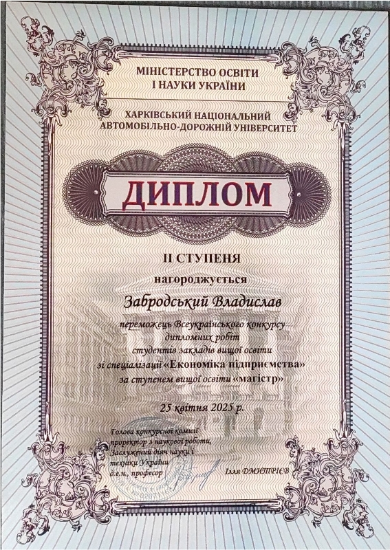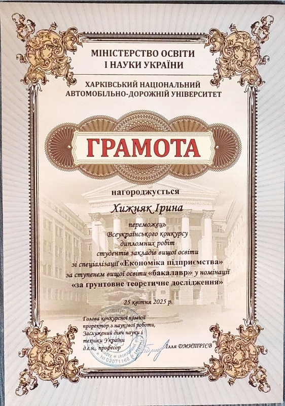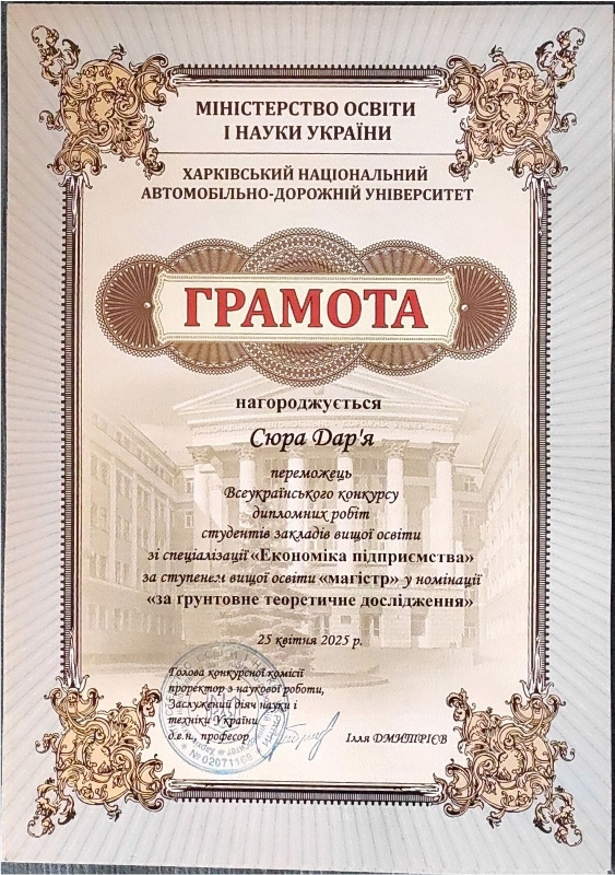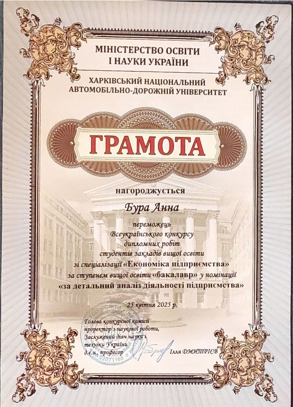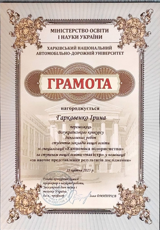 Радіємо успіхам здобувачів освіти кафедри економіки і права, що відзначилися результатами участі у Всеукраїнському конкурсі дипломних робіт студентів закладів вищої освіти зі спеціальності «Економіка підприємства» за ступенем вищої освіти «Бакалавр», «Магістр», який відбувся у Харківському національному автомобільно-дорожньому університеті.