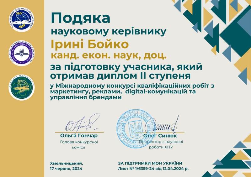 Кваліфікаційна робота «Оцінювання точок контакту бренду зі споживачами» Назарія Навроцького, виконана під науковим керівництвом доцентки кафедри маркетингу Ірини Бойко, посіла ІІ місце на Міжнародному конкурсі кваліфікаційних робіт з маркетингу, реклами, digital-комунікацій та управління брендами за другим (магістерським) рівнем вищої освіти.