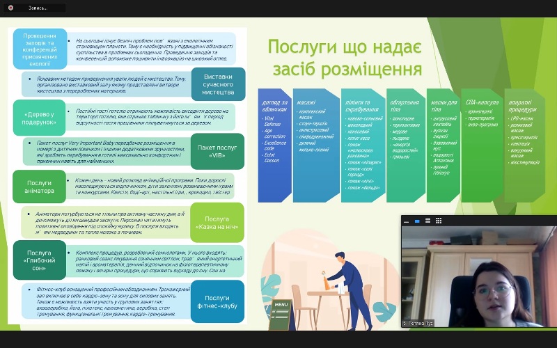 У підприємствах гостинності майбутні готельєри і ресторатори впровадили інноваційні рішення – систему інклюзивного обслуговування гостей, XR-технології, посилені заходи безпеки, оздоровчі програми для алергіків, комплекс інноваційних водних розваг, аглютенову дієтотерапію й виробництво інноваційної ресторанної продукції, зокрема безлактозної, у закладах харчування.