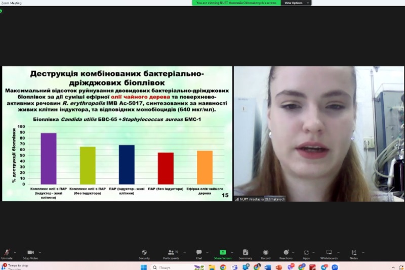 ІІ місцеМарія Дзюба (група ПФБ-1-1М) з роботою «Роль поверхнево-активних речовин та інших метаболітів Acinetobacter calcoaceticus IМВ В-7241 у біосинтезі наночастинок срібла з антибактеріальною дією» та Анастасія Охмакевич (група ПФБ-1-1М) з роботою «Деструкція комбінованих біоплівок за дії комплексу ефірних олій з поверхнево-активними речовинами Rhodococcus erythropolis IМВ Ac-5017, синтезованими за наявності дріжджів роду Saccharomyces»;