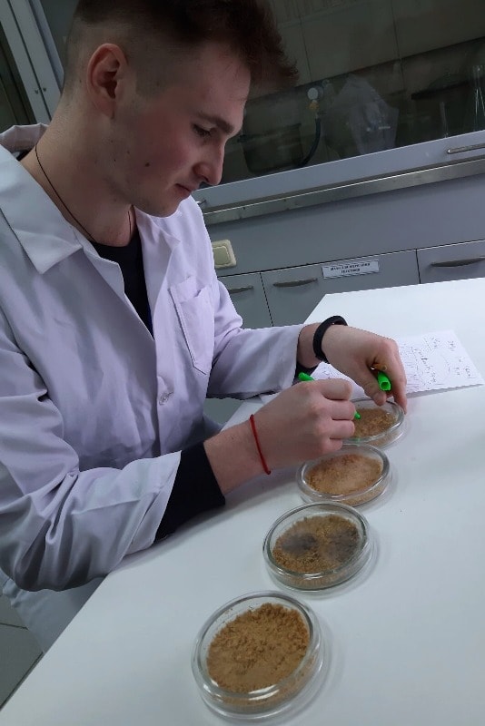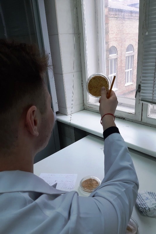 І на завершення історія студента групи БТ-3-1 Валентина Подолянчука, який виконує наукову роботу під керівництвом к.т.н., доцента Вікторії Красінько. Його наукова робота присвячена вивченню біотехнологічного потенціалу мікроміцетів для можливого використання їх у природоохоронних технологіях. Наразі об’єктом уваги молодого науковця є гриб Aspergillus oryzae, який відомий як продуцент багатьох біологічно активних речовин, зокрема ферменту глюкоамілази. Перші результати культивування цього гриба на післяспиртовій зерновій барді дозволили зрозуміти, що можна заощадити на процесі стерилізації! Гриб Aspergillus oryzae краще росте на нестерильній барді, ніж на стерильній. Це явище студент планує ретельно дослідити.