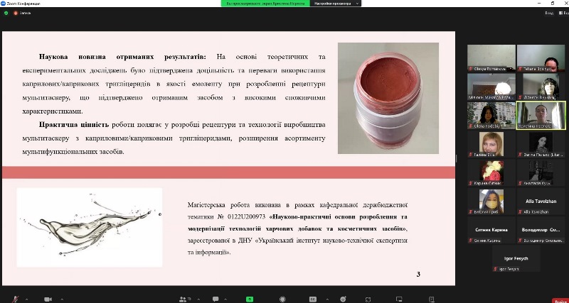 На кафедрі технології жирів, хімічних технологій харчових добавок та косметичних засобів 14, 16, 20 і 21 лютого 2024 року відбулися публічні захисти 22 кваліфікаційних робіт здобувачами освітнього ступеня «Магістр» денної та заочної форм навчання за спеціальністю 161 «Хімічні технології та інженерія».