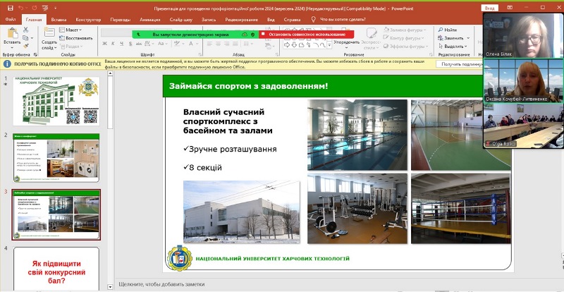 А професорка Оксана Кочубей-Литвиненко нагодою зустрітися з випускниками фахового коледжу за спеціальністю «Харчові технології» скористалася для розповіді їм про важливість продовження ступеневої освіти й переваги навчання в Національному університеті харчових технологій. Зокрема вона розповіла здобувачам коледжу про освітні інновації, запроваджені в університеті під час реалізації освітніх програм освітнього ступеня «бакалавр».