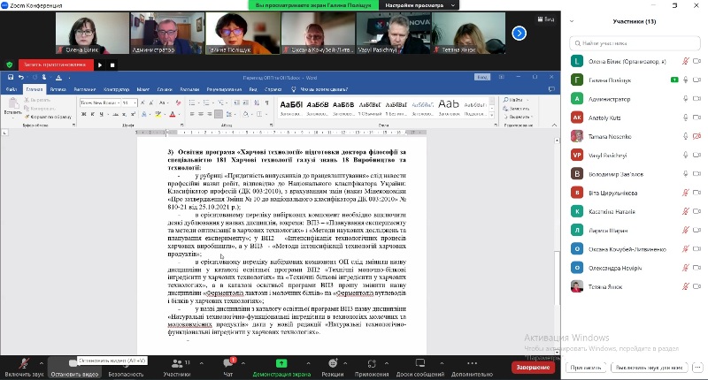 До проведення локального моніторингу долучилися директорка Навчально-наукового інституту харчових технологій Оксана Кочубей-Литвиненко, деканка факультету готельно-ресторанного та туристичного бізнесу ім. В.Ф. Доценка Віта Цирульнікова, завідувачка відділу аспірантури і докторантури Наталія Касаткіна та завідувачі технологічних кафедр університету. Особливу увагу під час обговорення приділили змісту освітньо-наукової програми, уточненню назв освітніх компонент та їх змісту.