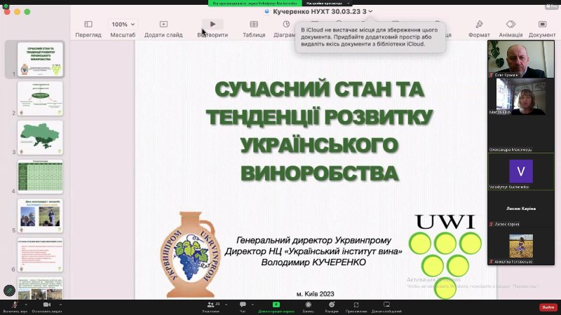 30 березня на кафедрі біотехнології продуктів бродіння і виноробства відбулася гостьова онлайн-лекція «Сучасний стан та тенденції розвитку українського виноробства», яку для студентів і аспірантів кафедри прочитав генеральний директор корпорації «Укрвинпром», директор НЦ «Український інститут вина», член Наглядової ради НУХТ Володимир Кучеренко. До лекції також приєдналися здобувачі освіти і викладачі інших кафедр університету.