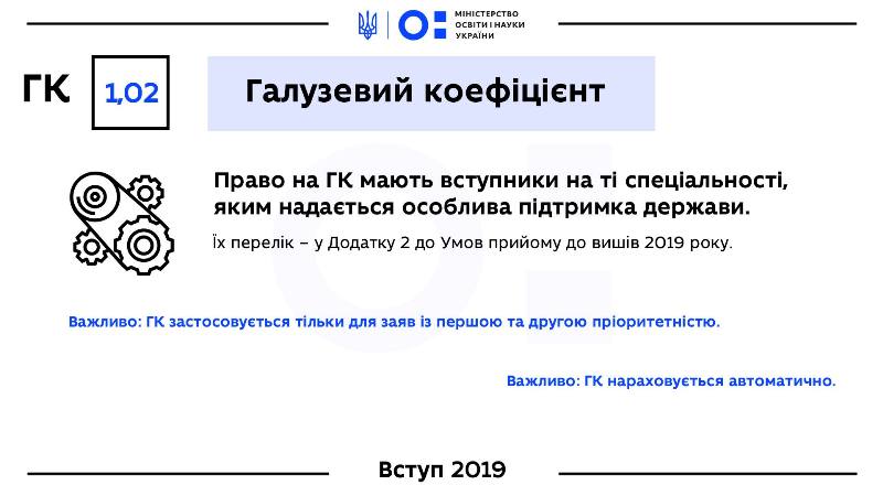 Галузевий коефіцієнт (ГК) дорівнює 1,02 і діє для вступників на ті спеціальності, яким надається особлива державна підтримка. Необхідно звернути увагу, що ГК застосовується тільки для заяв із першою та другою пріоритетністю.