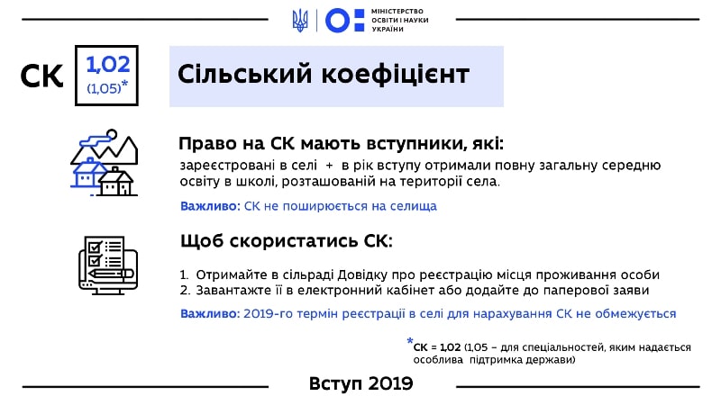 Так, претендувати на сільський коефіцієнт (СК) можуть ті, хто в рік вступу закінчили школу на території села й зареєстровані в селі. СК дорівнює 1,02 для всіх таких вступників, а також 1,05 для вступників на спеціальності, яким надається особлива державна підтримка.