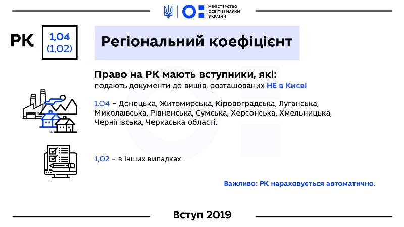 Регіональний коефіцієнт (РК) нараховується тим вступникам, які обирають виші НЕ в Києві. Для 11 регіонів РК дорівнює 1,04. Це такі області: Донецька, Житомирська, Кіровоградська, Луганська, Миколаївська, Рівненська, Сумська, Херсонська, Хмельницька, Чернігівська, Черкаська. В усіх інших випадках РК дорівнює 1,02.