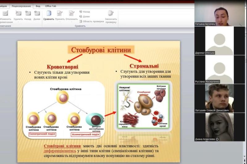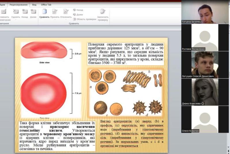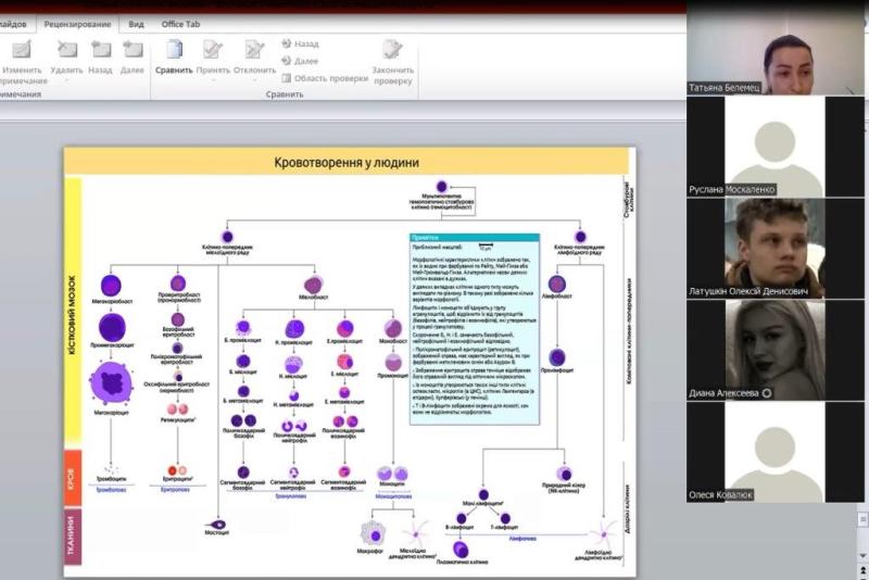 Під час заняття здобувачам була продемонстрована презентація з ілюстраціями мікроскопувань мазків крові людини та новітні 3-D моделі клітин кінцевих стадій мієлопоезу. Показ слайдів супроводжувався детальною доповіддю викладачки щодо основних етапів гемопоезу та розбором одного з основних питань біології розвитку –диференціації клітин.