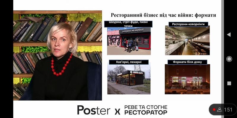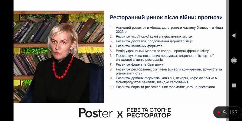 Прогнози спікерки щодо розвитку ресторанного бізнесу після війни: розвиток змішаних форматів закладів, діджиталізація бізнес-процесів, доставка, франчайзинг, проста кухня з локальних продуктів.