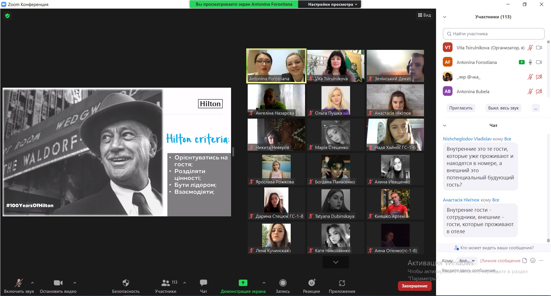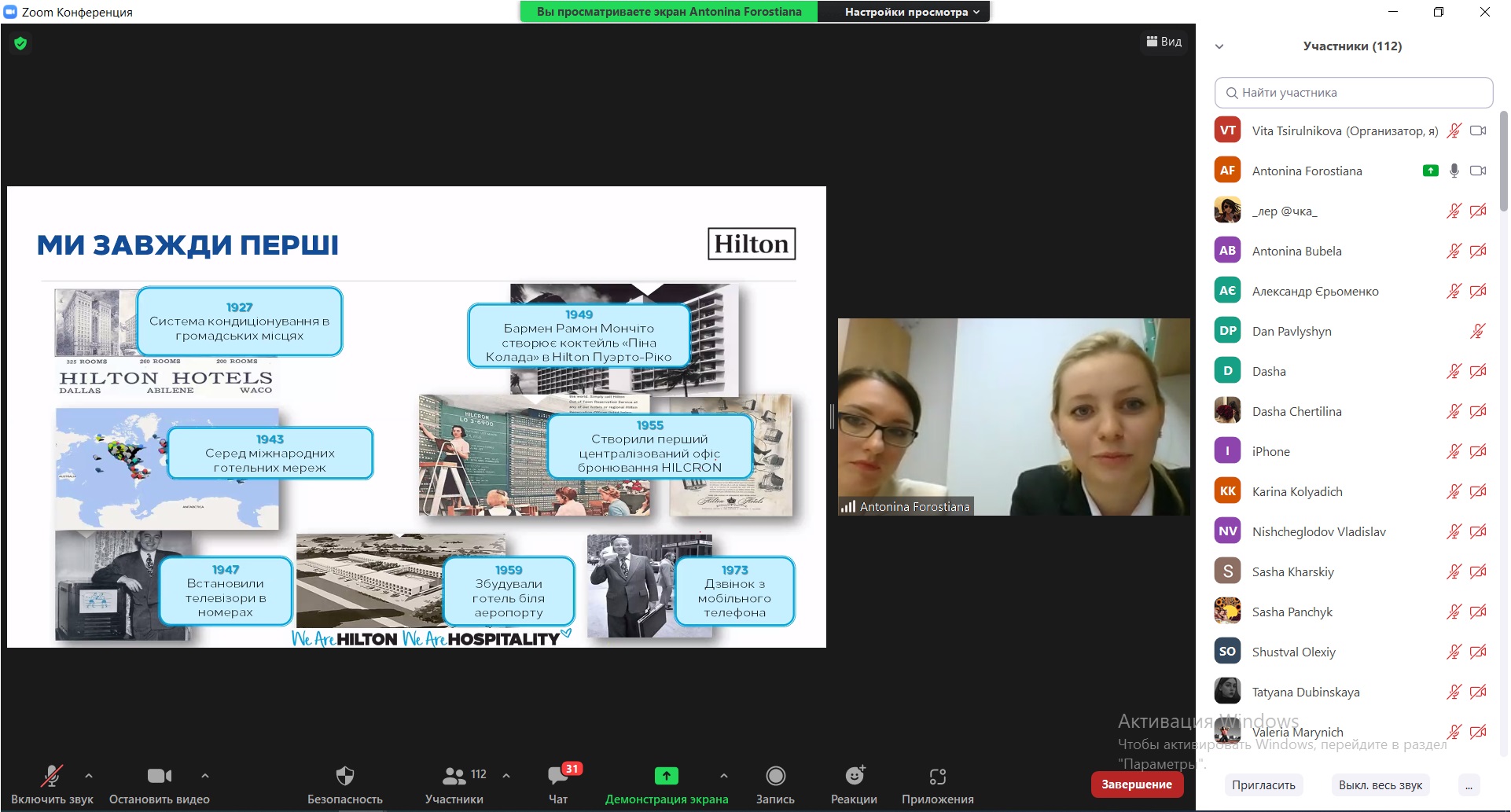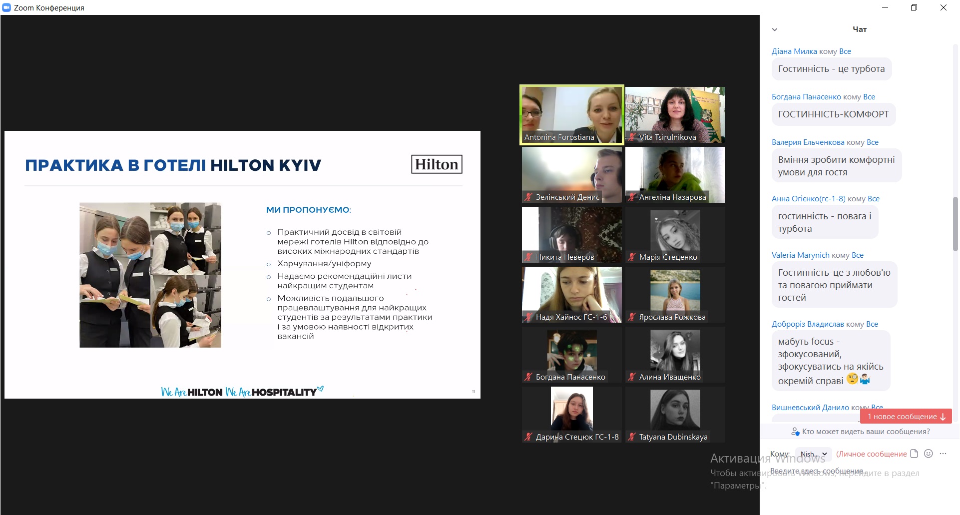 На відеозв’язку з одного з кращих вітчизняних готелів міжнародної мережі Hilton – начальниця управління по роботі з персоналом Анна Мєдвєдєва і менеджерка з навчання та розвитку персоналу Антоніна Форостяна. Вони презентували гостьовий лекторій про історію Hilton Kyiv, корпоративну культуру і цінності, особливості практичної підготовки, стажування і працевлаштування у Hilton Kyiv відповідно до високих міжнародних стандартів, лайфхаки з написання резюме і успішного проходження співбесіди, доповнені інтерактивним завданням.