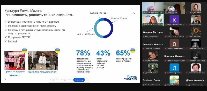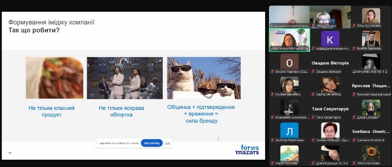 Студенти і викладачі щиро вдячні Юлії Левцовій за можливість ознайомитися з діяльністю компанії Forvis Mazars, зокрема з їхньою креативною і унікальною роботою у сфері формування іміджу! Багато цікавих питань залишилося поза увагою вебінару, тому усі з ентузіазмом домовилися про нову зустріч.