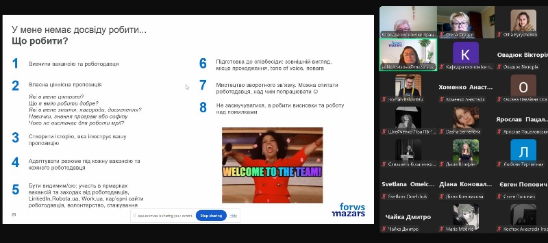 Лекторка надала цікаві поради ‒ що робити студентам, коли немає досвіду, про процедуру стажування у компанії, джерела пошуку роботи.