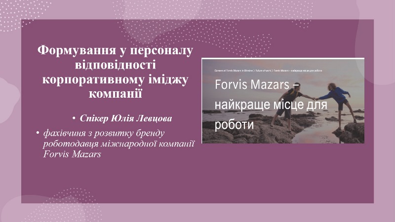 Фахівчиня розкрила особливості іміджу Forvis Mazars ‒ чітко визначати свою унікальність на ринку аудиту і консалтингу з акцентом на: високий рівень професійної компетенції, міжнародний досвід і глобальну присутність, індивідуальний підхід до кожного клієнта, орієнтацію на сучасні інноваційні рішення та технології у сфері аудиту.